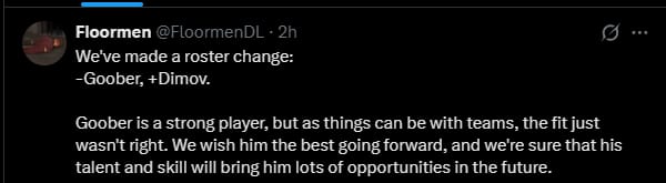 Floormen have made a big change, moving on from Goober and bringing in Dimov from Leviathan. On paper, it is one of the more interesting roster bets North America has seen in a while.